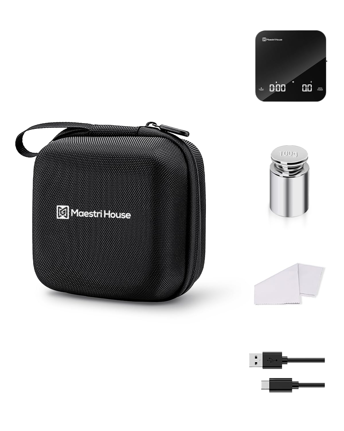 Maestri House Mini Coffee Scale Barista Kit with 100g Calibration Weight & Carrying Case, Rechargeable Espresso Scale with Timer, 0.1g Precision 2kg Kitchen Scale, Portable for Pour Over & Travel Gift Box-BS