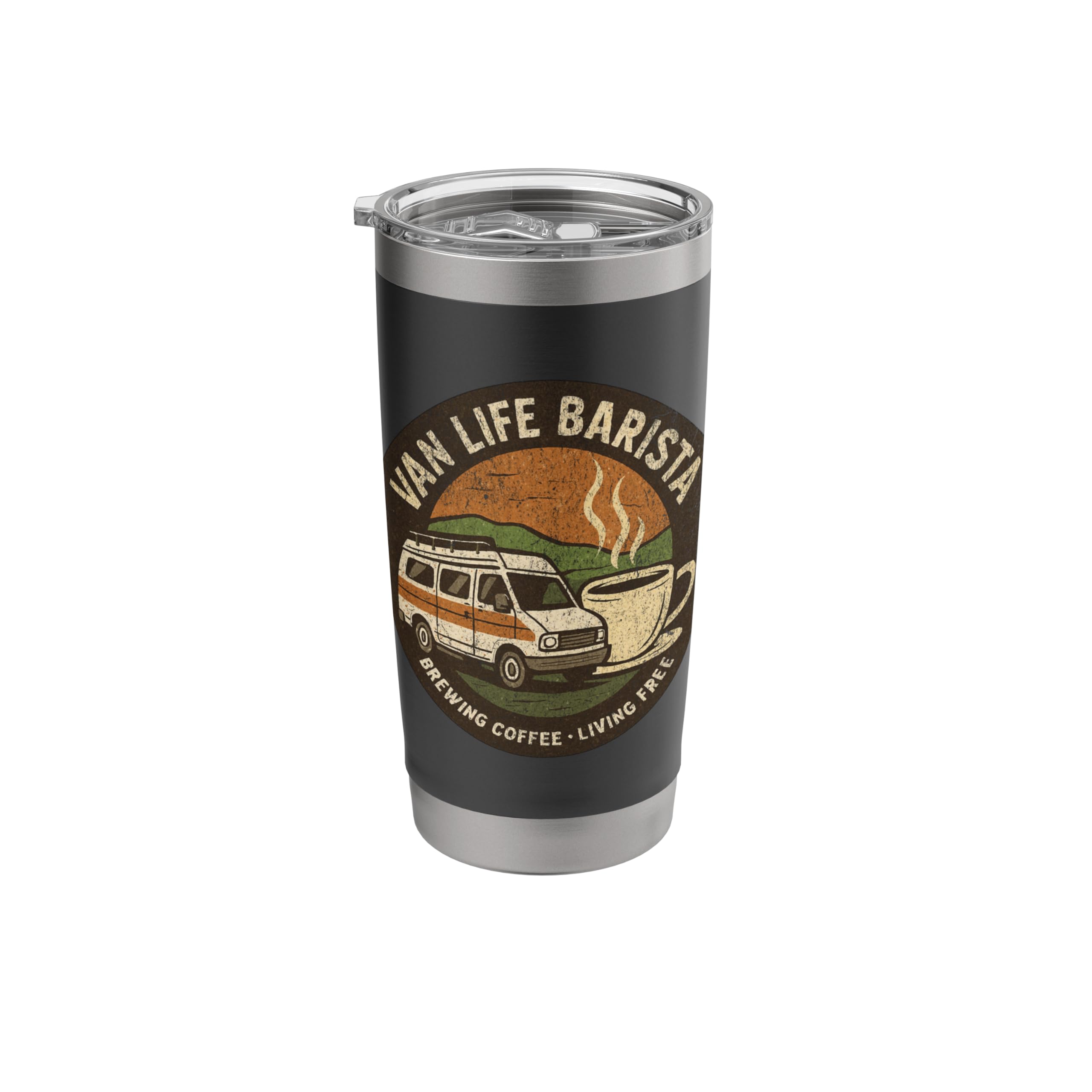 Van Life Barista Brewing Coffee, Living Free Camper Stainless Steel Insulated Tumbler 20 Ounces Black